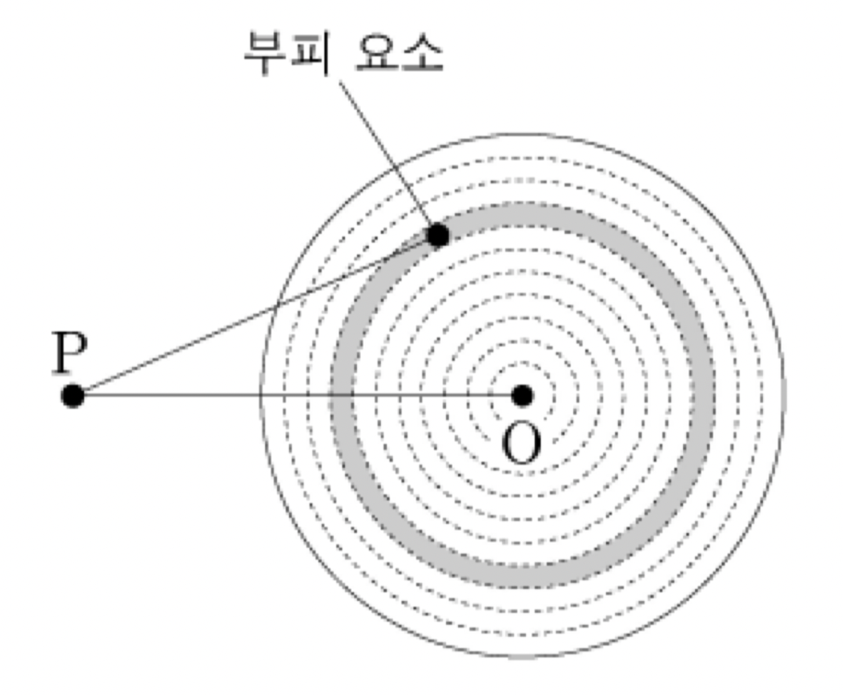 구는 무한히 작은 부피 요소들로 이루어져 있다. 그 부피 요소들이 빈틈없이 한 겹으로 배열되어 구 껍질을 이루고, 그런 구 껍질들이 구의 중심 O 주위에 반지름을 달리하며 양파처럼 겹겹이 싸여 구를 이룬다. 이때 부피 요소는 그것의 부피와 밀도를 곱한 값을 질량으로 갖는 질점으로 볼 수 있다.