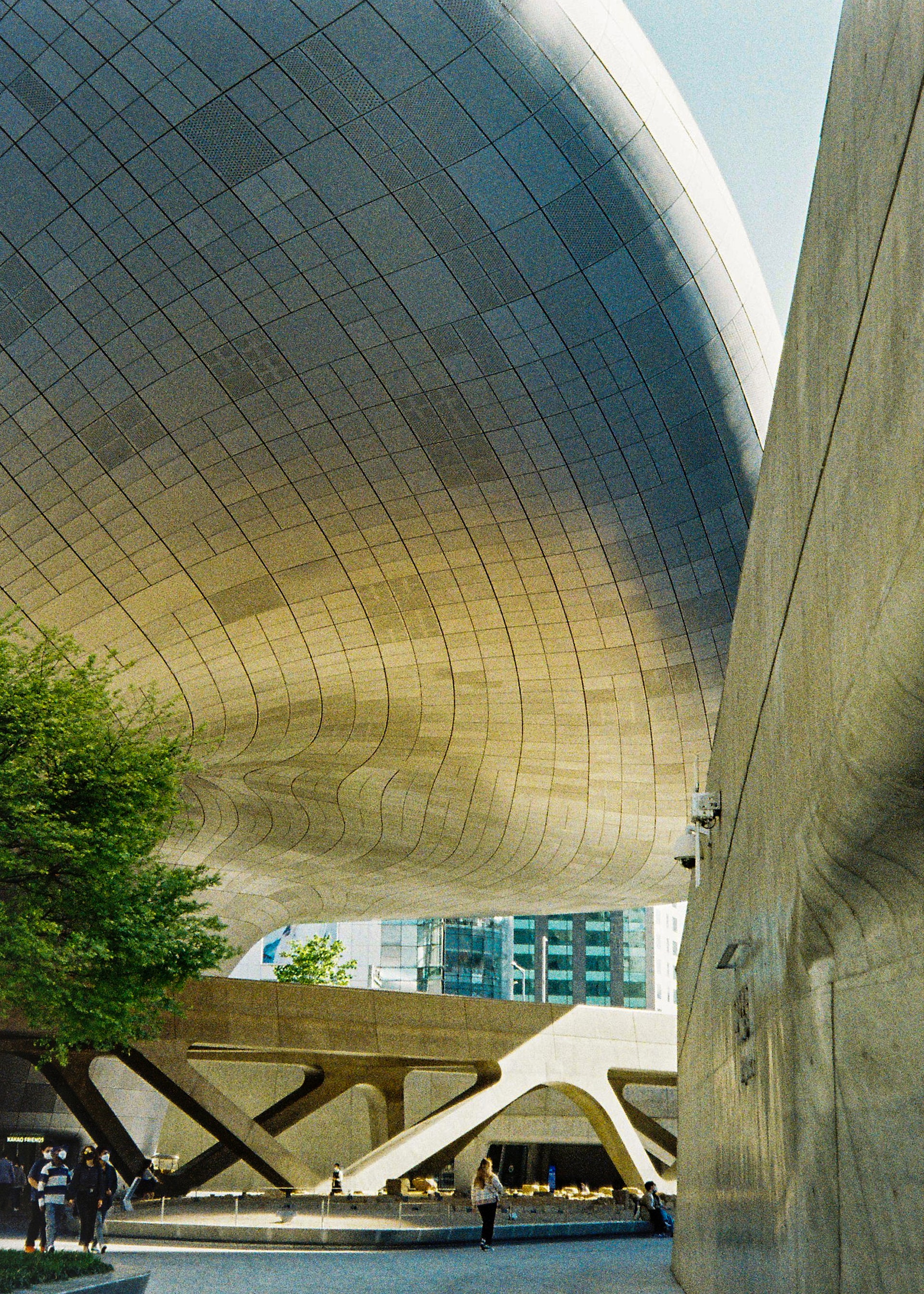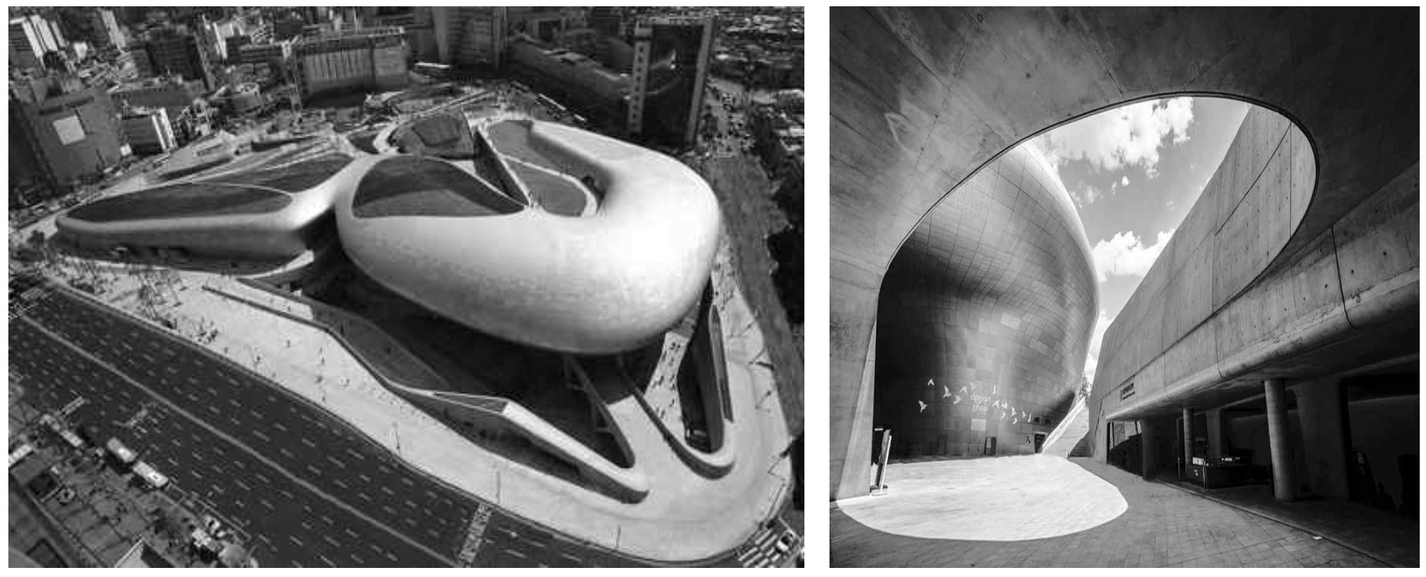 우리나라의 동대문디자인플라자(DDP)는 이러한 랜드스케이프 건축의 특성이 잘 드러나 있는 건물이다. DDP의 표면은 주름진 곡선이 연속적으로 이어지고 있는데, 하늘에서 ⓔ내려다 보면 건물 전체가 대지를 덮고 있는 형상을 띠고 있다. 또한 주름진 곡선에 의해 만들어진 내부의 공간들은 디자인 전시관으로 활용되기도 하지만, 경우에 따라 패션 행사나 다양한 체험 마당 등 다양한 용도로 활용된다. 특히 DDP는 기존에 있던 지하철역이 건물의 지하 광장과 건물의 입구로 이어지도록 만들어졌으며, DDP 외부의 공원과 건물 간의 경계가 없어 공원을 걷다 보면 자연스럽게 건물의 내부로 이어지고, 내부에서 옥상의 잔디 언덕으로 이동하게 되면서 다시 건물 밖의 공원으 로 나오게 되는데, 이런 점 때문에 DDP는 기존에 존재하는 것들과 통합을 추구하였다는 평가를 받고 있다.