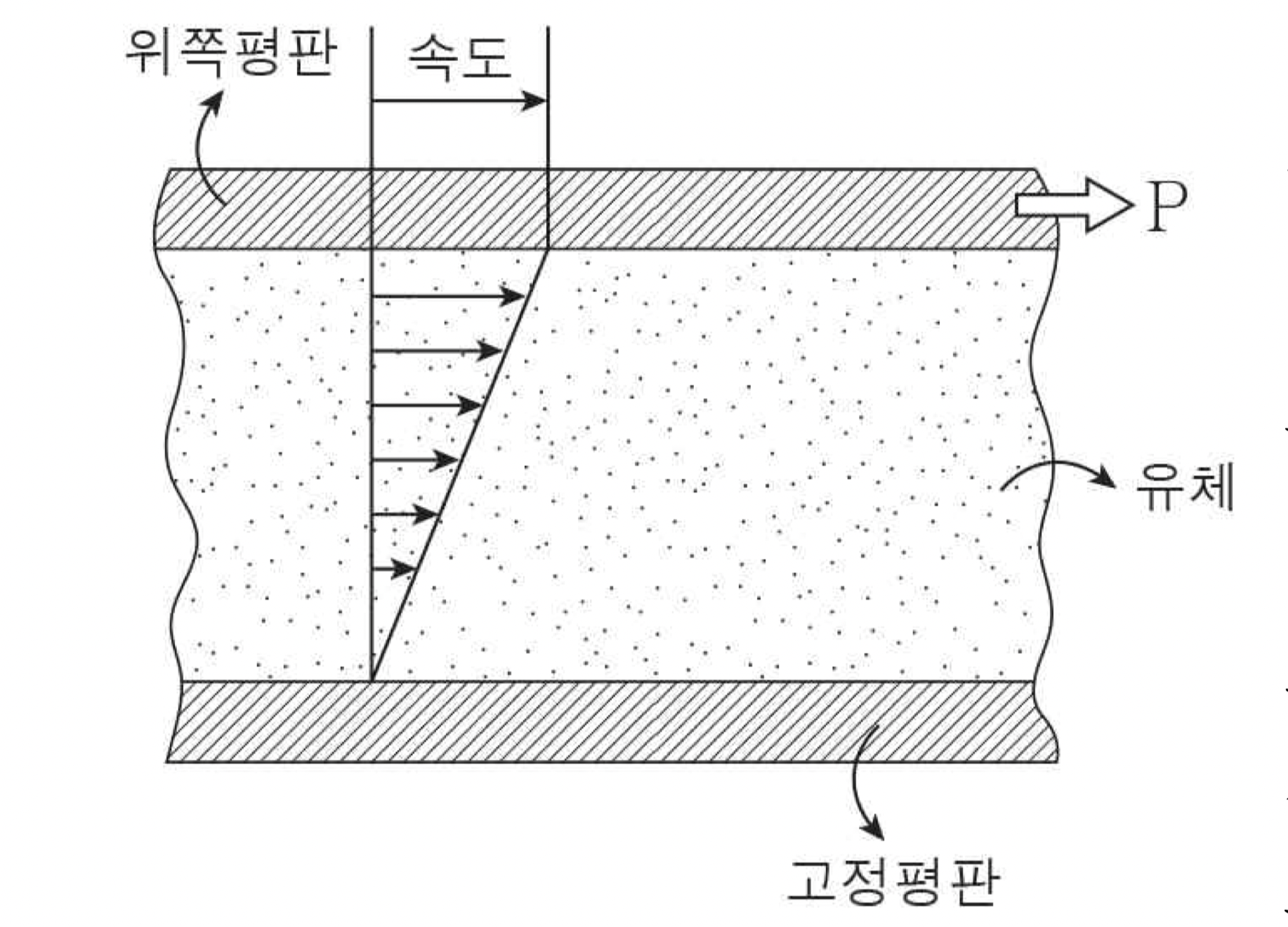 <그림>의 실험과 같이 매우 넓은 두 평행평판 사이에 어떤 유체가 들어 있는 경우를 가정해 보자. 이 때 평행평판 중 아래쪽은 고정되어 움직이지 않는 고 정평판이고, 위쪽평판은 자유롭게 움직일 수 있다. 다른 힘이 작용하지 않는다고 할 때 위쪽평판에 P 방향으로 힘이 가해지면 위쪽평판이 P 방향으로 일정한 속도로 운동하게 된다. 위쪽평판의 운동에 따라 평판 사이의 유체에는 전단응력이 발생하게 된다. 이후 유체를 ㉢ 이루는 입자들은 일정한 속도로 운동하기 시작하고 그에 따라 유체는 연속적으로 그 모습이 변형된다. 이때 위쪽평판에 접하고 있는 유체 입자들은 위쪽평판과 동일 속도로 이동하고, 고 정평판에 접하고 있는 유체 입자들은 이동하지 않는다. 이는 유 체가 지닌 점성 때문에 ㉣ 나타나는 현상이다. 그리고 <그림> 에서처럼 두 평판 사이에 있는 유체 입자들의 속도는 고정평판으로부터 위쪽평판 사이의 거리에 비례하여 일정한 비율로 커진다. 그런데 <그림>에서 전단응력이 증가하게 되면 유체 입자들의 속도도 증가하게 되고, 이에 따라 유체의 변형이 커져 전 단응력에 따른 시간당 유체가 변형되는 변화율을 의미하는 전 단변형률도 커지게 된다. 이를 수식으로 나타내면,