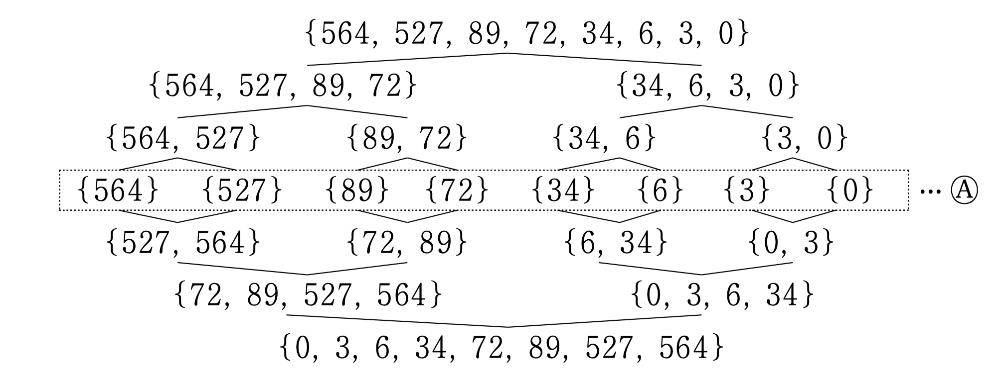 ㉡ 병합 정렬은 정렬하려는 집합을 두 개의 부분 집합으로 반복 분할한 뒤 다시 병합하면서 하나의 정렬된 집합으로 만드는 방식이다. 집합을 이루는 원소의 개수가 적을수록 정렬에 필요한 연산 횟수가 줄어든다. 집합 {564, 527, 89, 72, 34, 6, 3, 0}의 원소를 오름차순으로 정렬할 때 병합 정렬을 사용 하는 경우, ㉮ <그림>의 Ⓐ와 같이 8개의 부분 집합이 될 때 까지 전체 집합을 분할한다.