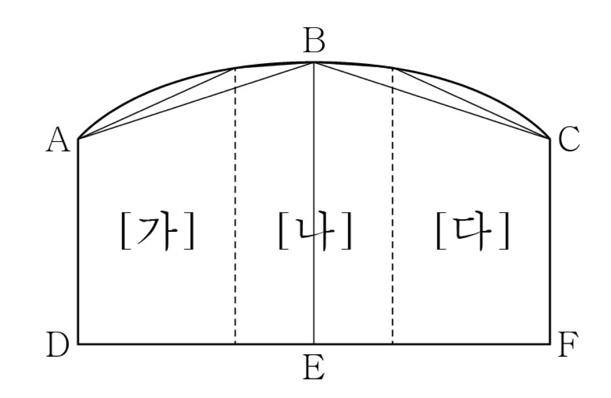 선박의 물에 잠길 부분이 직육면체라면 부피를 계산하는 것이 어렵지 않다. 하지만 선박은 대부분 유선형이고, 특히 뱃머리인 선수 부분과 배의 뒷부분인 선미 부분은 곡선 형태이기 때문에 선박의 물에 잠길 부분의 부피를 구하는 것이 간단하지 않다. 그래서 이 부피 계산에 사용되는 것이 심프슨 공식이다. 심프슨 공식은 면적을 계산하고자 하는 도형을 여러 개의 작은 사다리꼴로 나누어, 그 사다리꼴의 면적을 계산해 합산함으로써 실제 도형 면적의 근삿값을 구하는 공식이다. <그림>에서 선박의 수직 단면과 유사한 도형 ABCFD의 면적을 계산하려면, 사다리꼴 ABED와 사다리꼴 BCFE의 면적을 계산해 합산하면 된다. 하지만 2개로 구분된 구간을 [가], [나], [다]의 3개의 구간으로 나누어 계산하면 더 정밀한 근삿값을 얻을 수 있다. 이런 식으로 ㉡횡축 즉 선박의 폭을 여러 개의 구간으로 세분한 후, 이 구간들의 면적을 합산하면 수직 단면적의 근삿값을 더욱 정밀하게 계산할 수 있다.